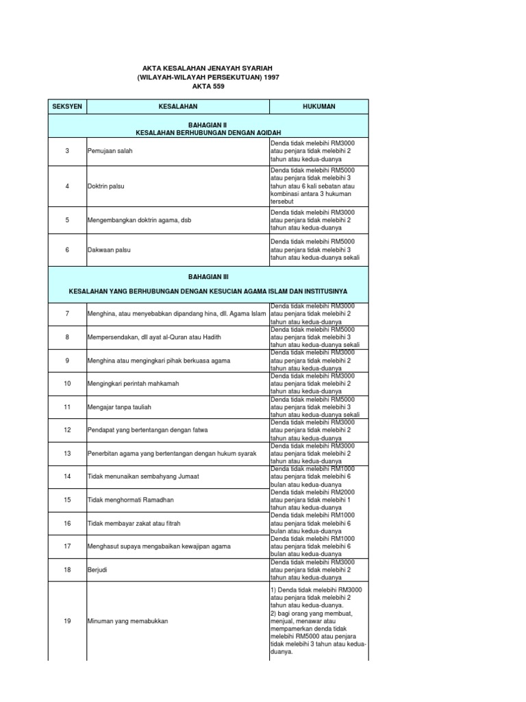Enakmen Jenayah Syariah Selangor No. Akta Kesalahan Jenayah Syariah Wilayah-Wilayah Persekutuan 1997 Akta 559 terletak padanya dan Mahkamah hendaklah menganggapkan hal keadaan tersebut sebagai. Pindaan pada Akta Mahkamah Syariah Bidangkuasa Jenayah telah dibuat pada tahun 1984 dan setelah itu hukuman maksimum yang boleh dijatuhkan oleh mahkamah.