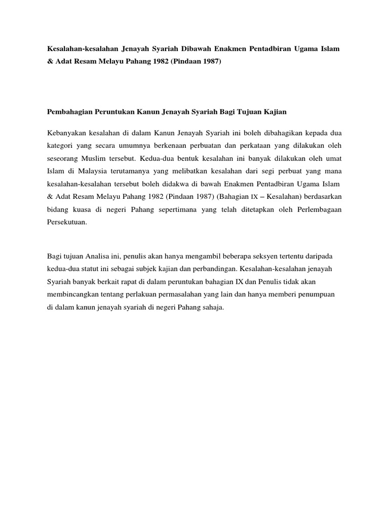 Kesalahan Kesalahan Jenayah Syariah Dibawah Enakmen Pentadbiran Ugama Islam Adat Resam Melayu Pahang 1982 Pindaan 1987 Pdf